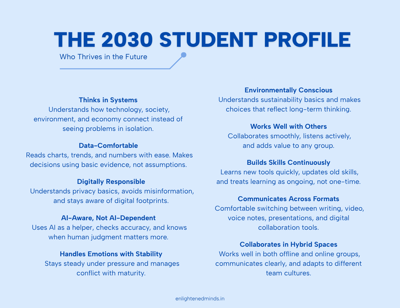 The students who thrive in 2030 will be the ones who mix clarity, digital confidence, emotional steadiness, and the ability to learn fast. This profile shows the traits that will matter long after today’s trends fade.