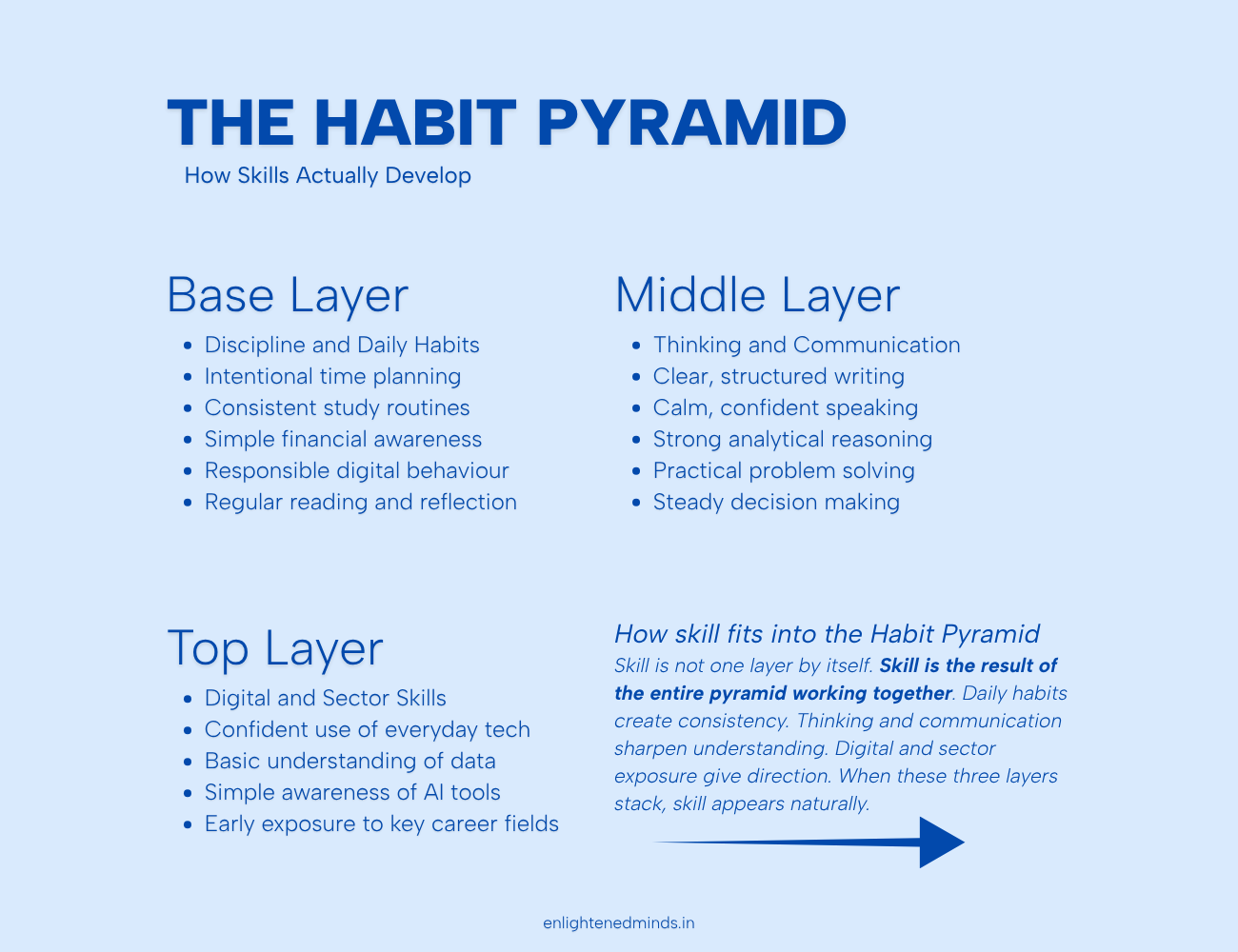Skills don’t appear out of nowhere. They grow from steady habits, clear thinking, and the confidence to use new tools. This habit pyramid shows the simple truth: when the base is strong, every other part of learning becomes easier.